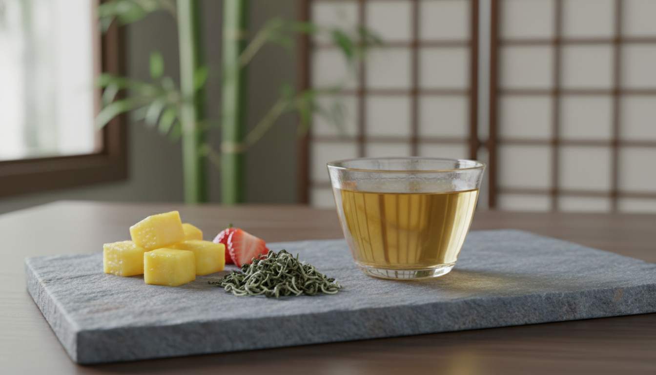 V chuti se nejprve rozvíjí čistý a jemně svěží základ zelených čajů, který postupně přechází do kulatějšího a lehce nasládlého dojmu díky bílému čaji Pai Mu Tan. Kandovaný ananas přináší do směsi příjemnou ovocnou měkkost a plátky jahod dodávají lehký sladce ovocný akcent. Celkový projev je vyvážený, jemně ovocný a velmi příjemně uhlazený, bez těžkosti a s elegantním dozvukem.