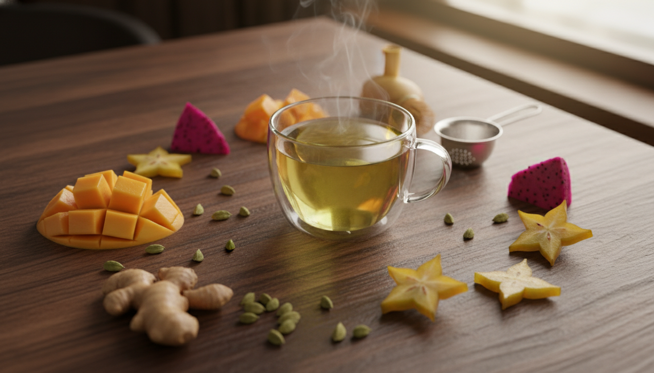 V chuti se nejprve rozvíjí jemný zelený čaj s lehce zaobleným dojmem, do kterého vstupují sladší exotické tóny manga, papáji a ananasu. Zázvor s kardamomem dodávají směsi kořeněný a lehce orientální akcent, který čaj krásně odlišuje od běžných ovocných směsí. Kokos a jemné květinové prvky chuť zjemňují, takže výsledný dojem působí plně, harmonicky a přitom bez výrazné svíravosti.