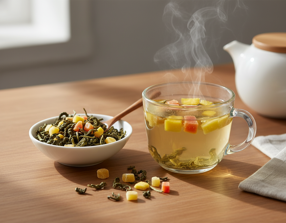 Příprava je jednoduchá, ale jako u každého zeleného čaje je dobré dodržet správnou teplotu vody. Vroucí voda se nedoporučuje, protože by mohla zbytečně vytáhnout trpkost a potlačit jemnější stránku směsi. Ideální je použít vodu o teplotě 80 až 85 °C a na jeden litr vody dát přibližně 10 až 12 gramů čaje. Doporučená doba louhování je 2 až 3 minuty podle toho, jak intenzivní nálev máte rádi. Kratší příprava zvýrazní lehkost a svěžest, delší naopak vytáhne plnější ovocné a kořeněné tóny.
