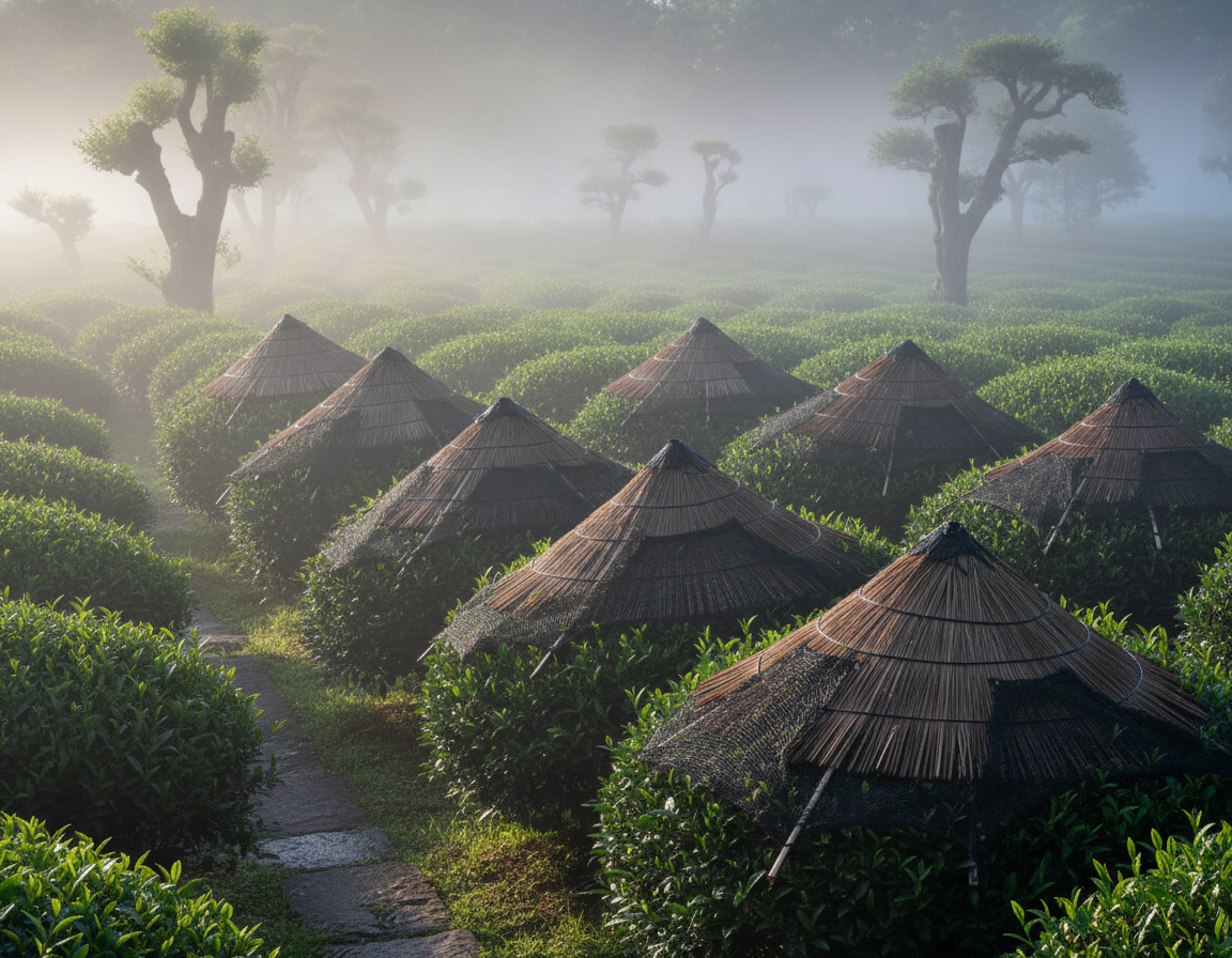 To, co dělá gyokuro tak zvláštním, začíná už na čajovníkové zahradě. Přibližně dva až tři týdny před sklizní se keře zastíní, tradičně například rohožemi nebo moderními sítěmi. Díky menšímu množství světla si listy udržují více chlorofylu a theaninu, zatímco hořké tóny bývají jemnější než u řady běžných zelených čajů. Právě proto má gyokuro tak typickou tmavě zelenou barvu listu, hladší charakter a výraznou chuťovou hloubku, kterou si s jinými zelenými čaji spletete jen těžko.