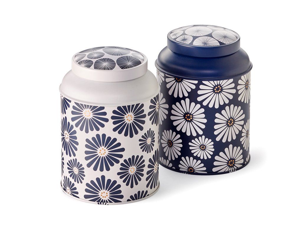 Varianta Blue staví na nadčasové kombinaci tmavě modré a bílé – výrazné kopretiny mají vysokou čitelnost a krásně vyniknou i z dálky na polici. Matná povrchová úprava působí moderně a decentní metalické prvky dodávají motivu „šperk“ bez zbytečné okázalosti. Hezký detail najdeš i na horní straně víčka, která motiv abstraktně zopakuje a vizuálně propojí víčko s tělem dózy.