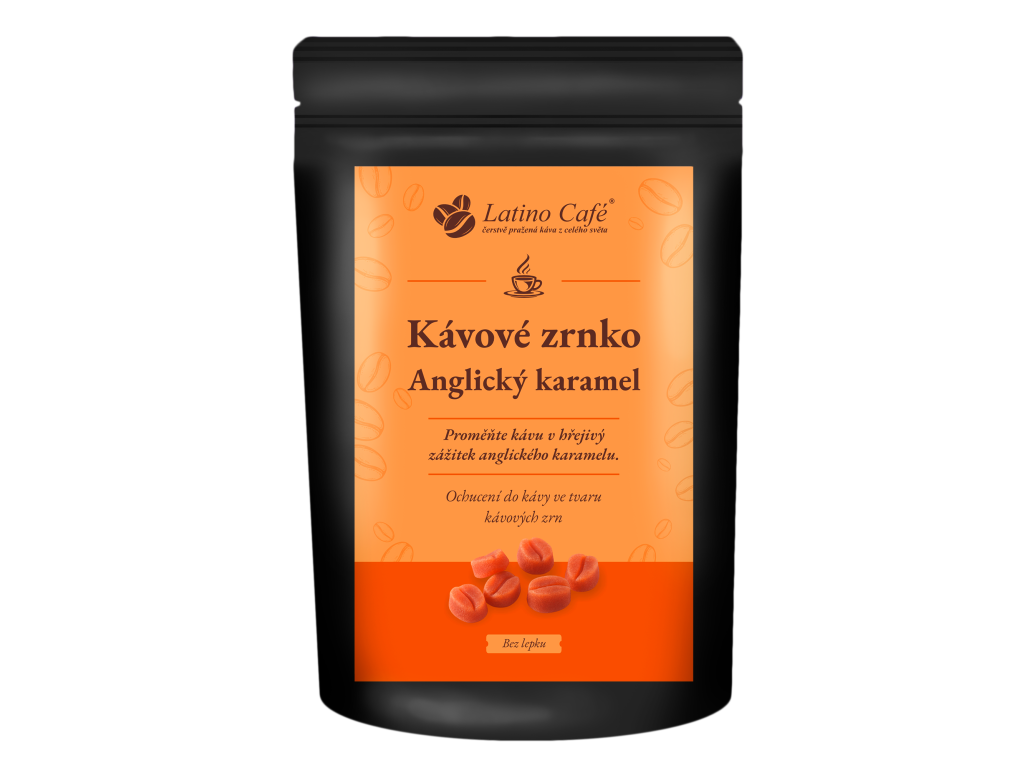 Kávové zrnko – Anglický karamel přináší do světa Latino Café stylové ochucení do kávy, které spojuje jemnou sladkost s hladkým karamelovo-oříškovým charakterem. Díky tvaru malých kávových zrn působí atraktivně už na první pohled a z každého šálku vytváří příjemný, voňavý rituál.