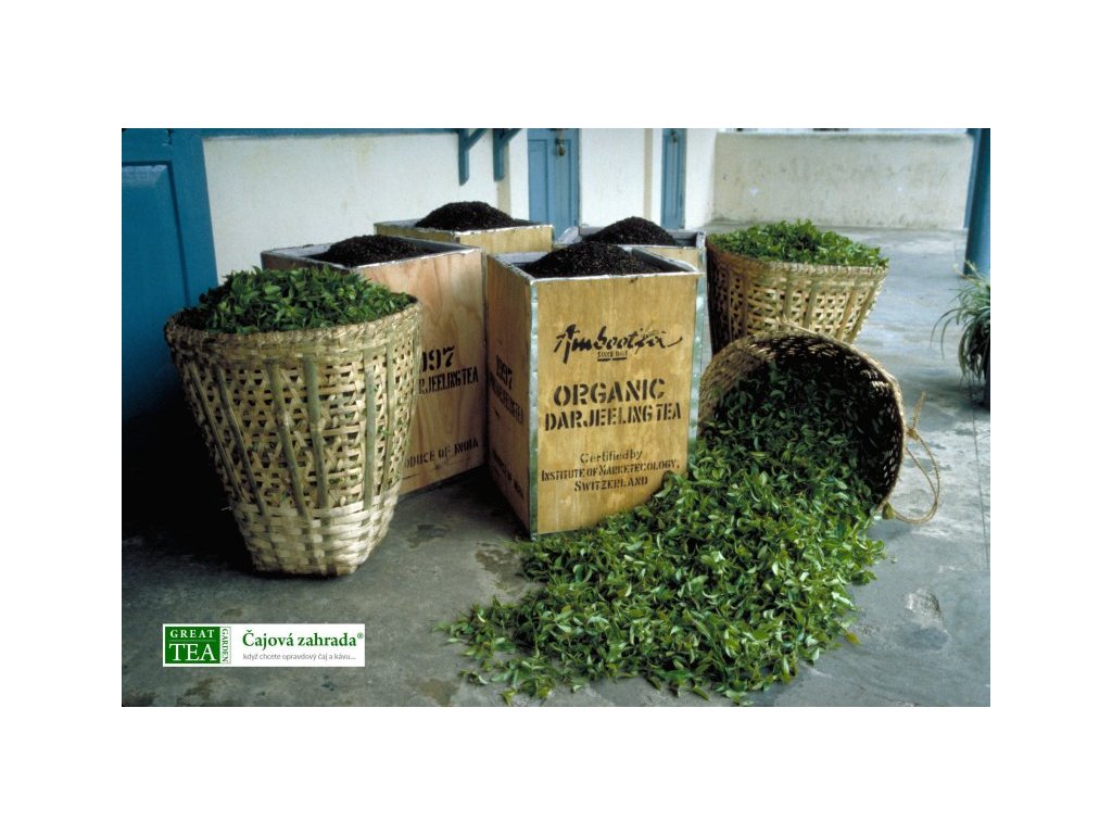 Plakát s vyobrazením košů s nezpracovanými čajovými lístky z plantáže Ambootia v indické oblasti Darjeeling, která produkuje čaje v biokvalitě, a dřevěných beden určených pro transport hotového čaje. Skvělý k výzdobě čajovny i jako dekorace do bytu či kanceláře opravdového milovníka čaje.