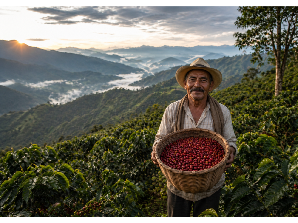 „Autentický okamžik sklizně kávy v srdci kolumbijských hor.“