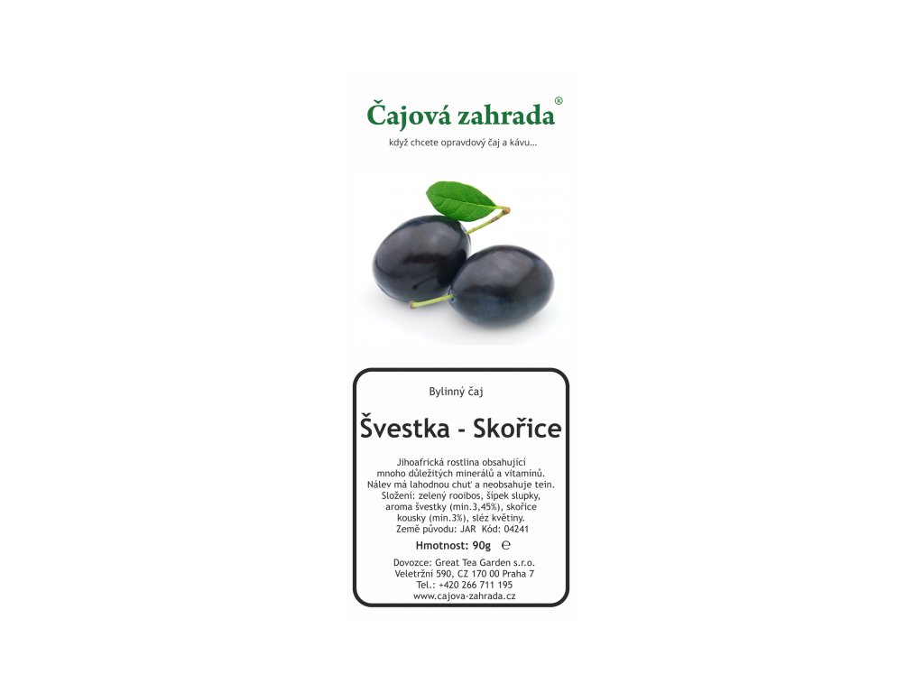 Složení: zelený rooibos, šípek slupky, aroma švestky (min.3,45%), skořice kousky (min.3%), sléz květiny.
